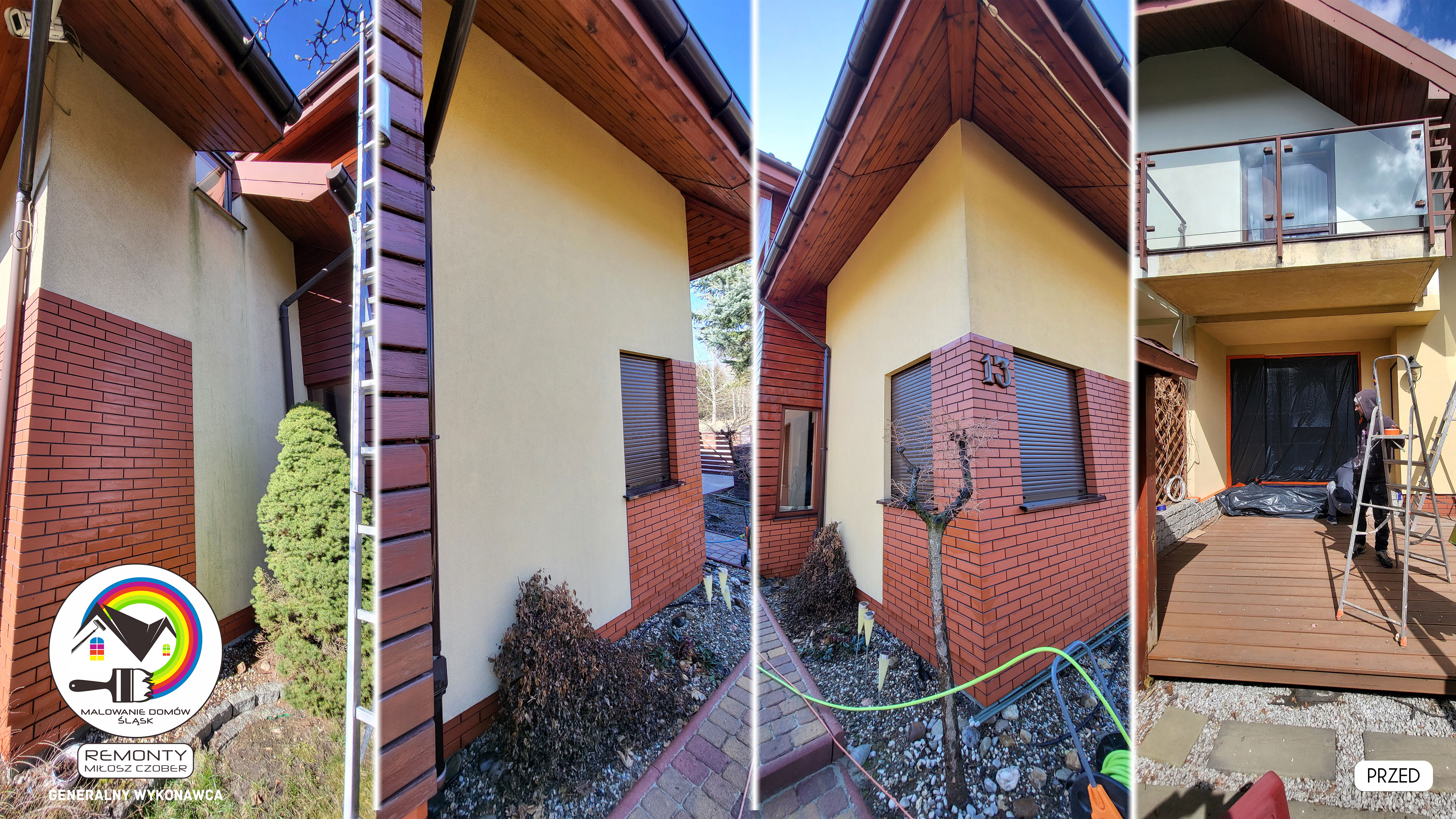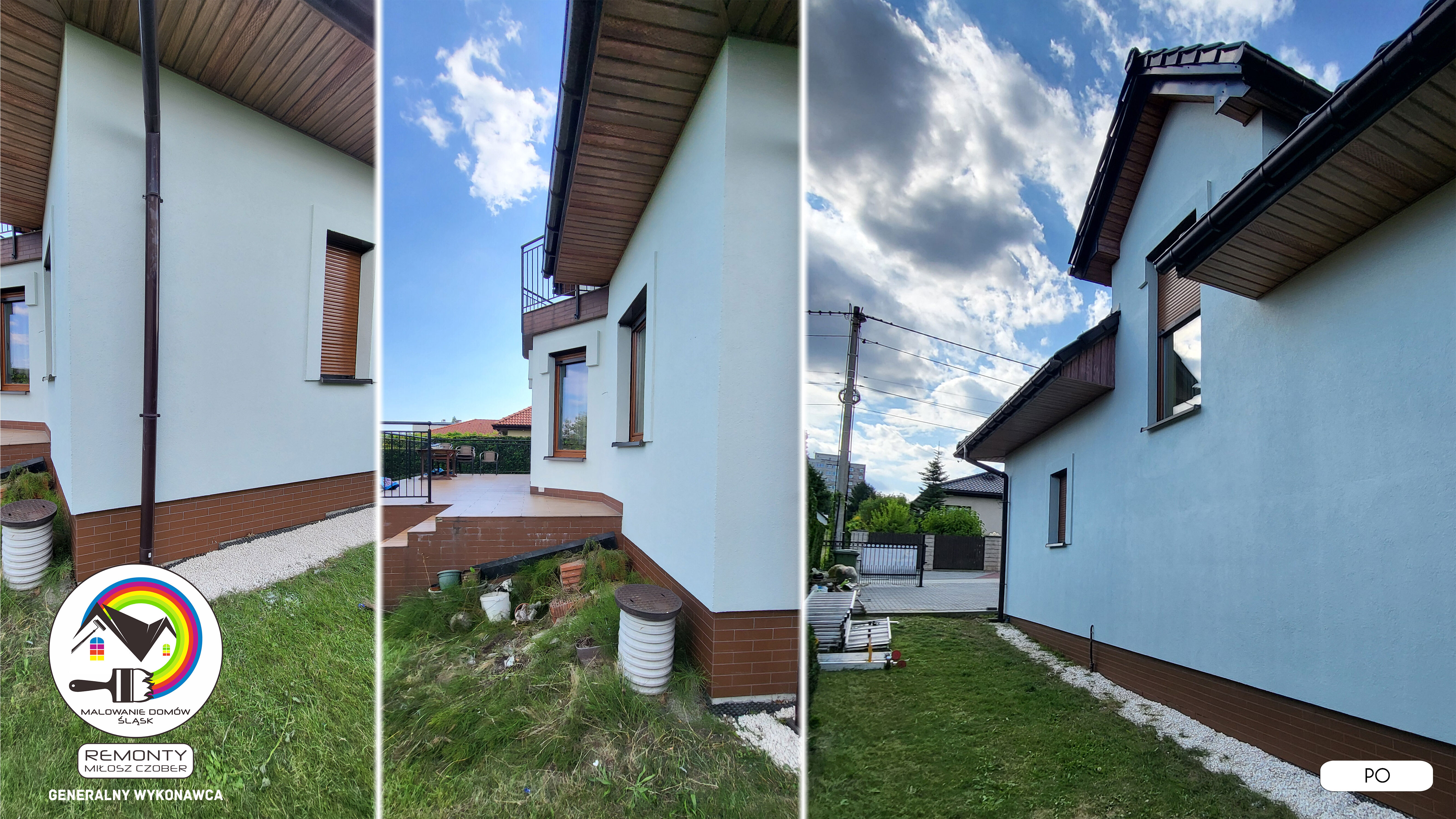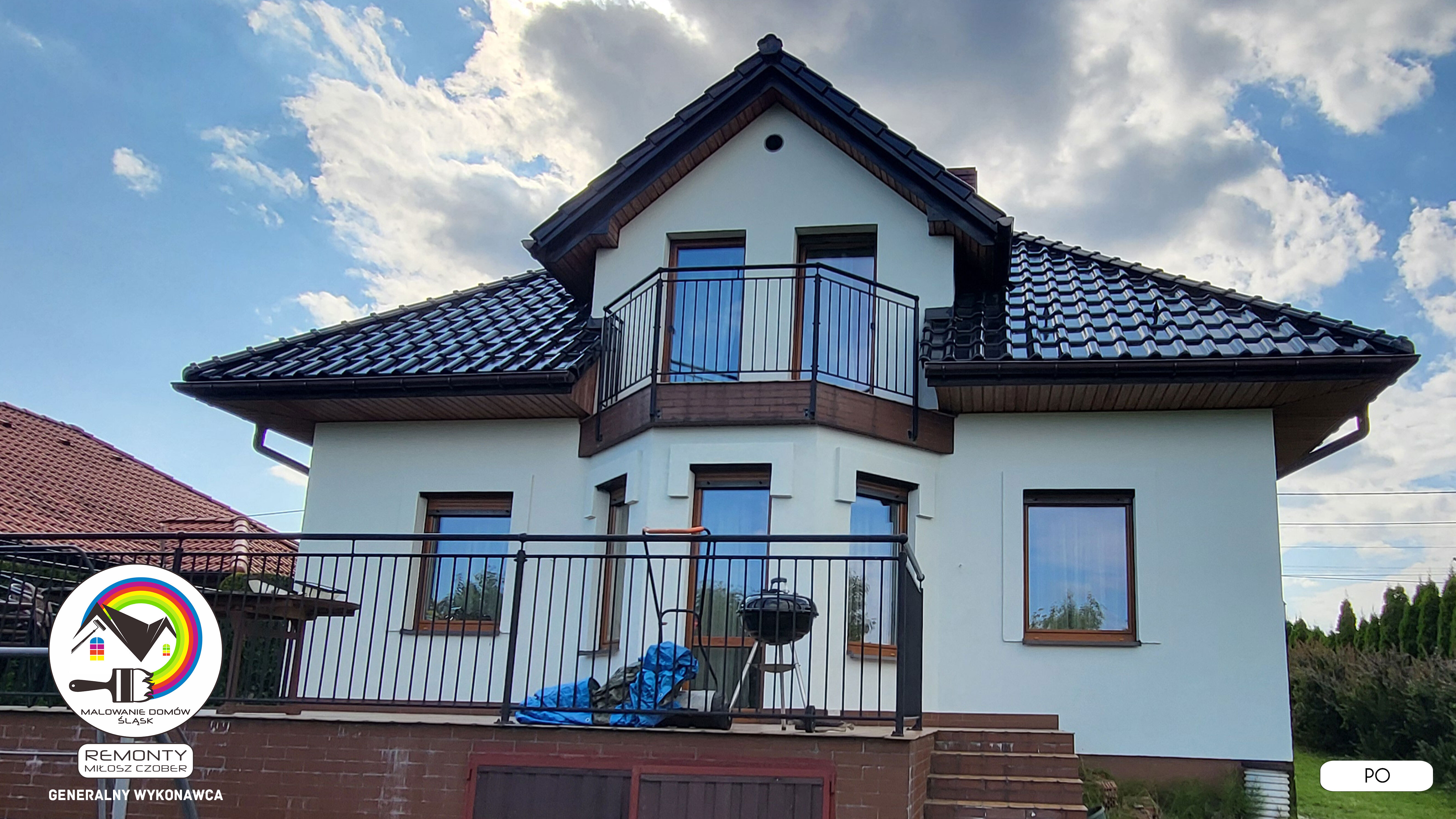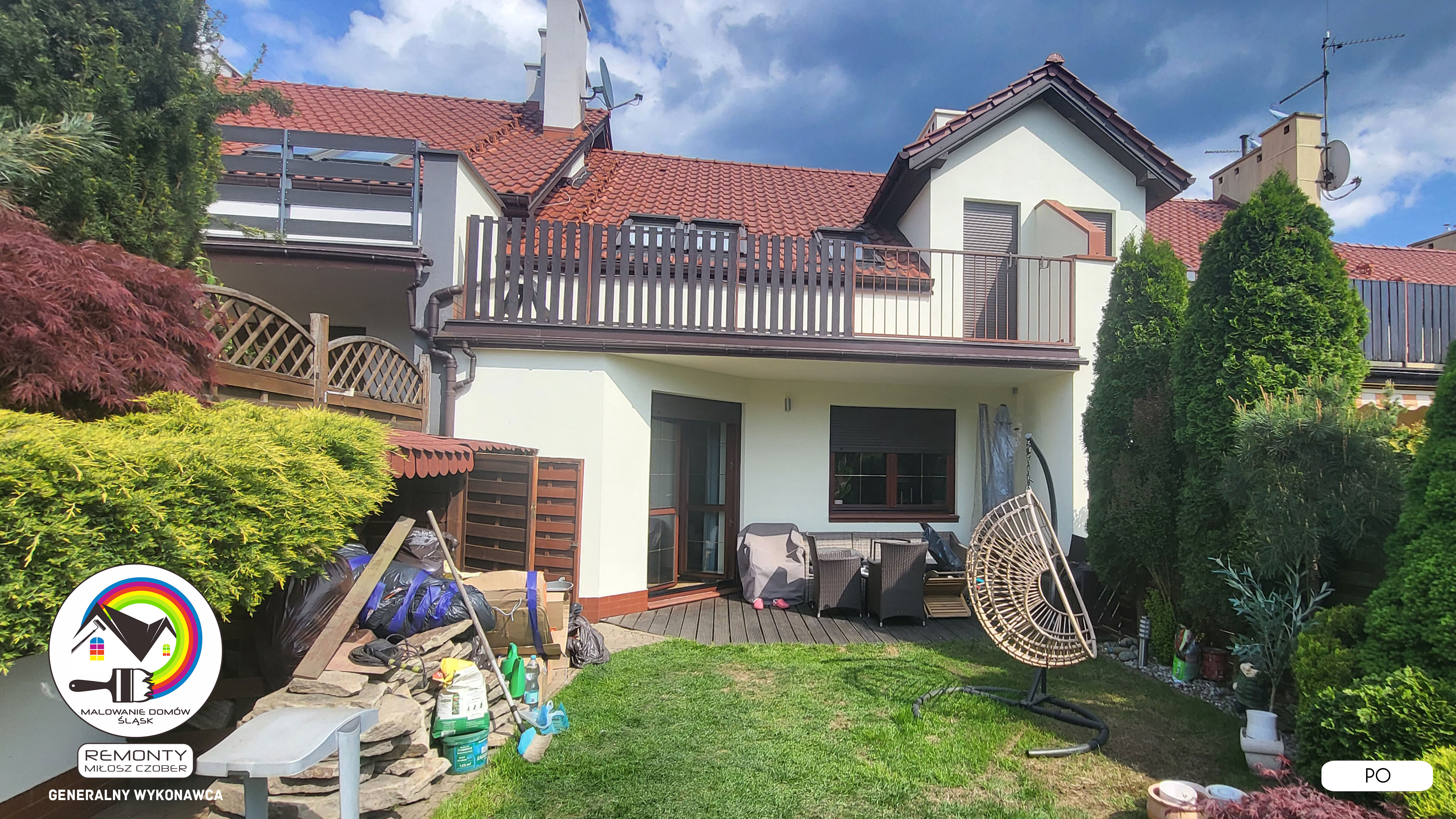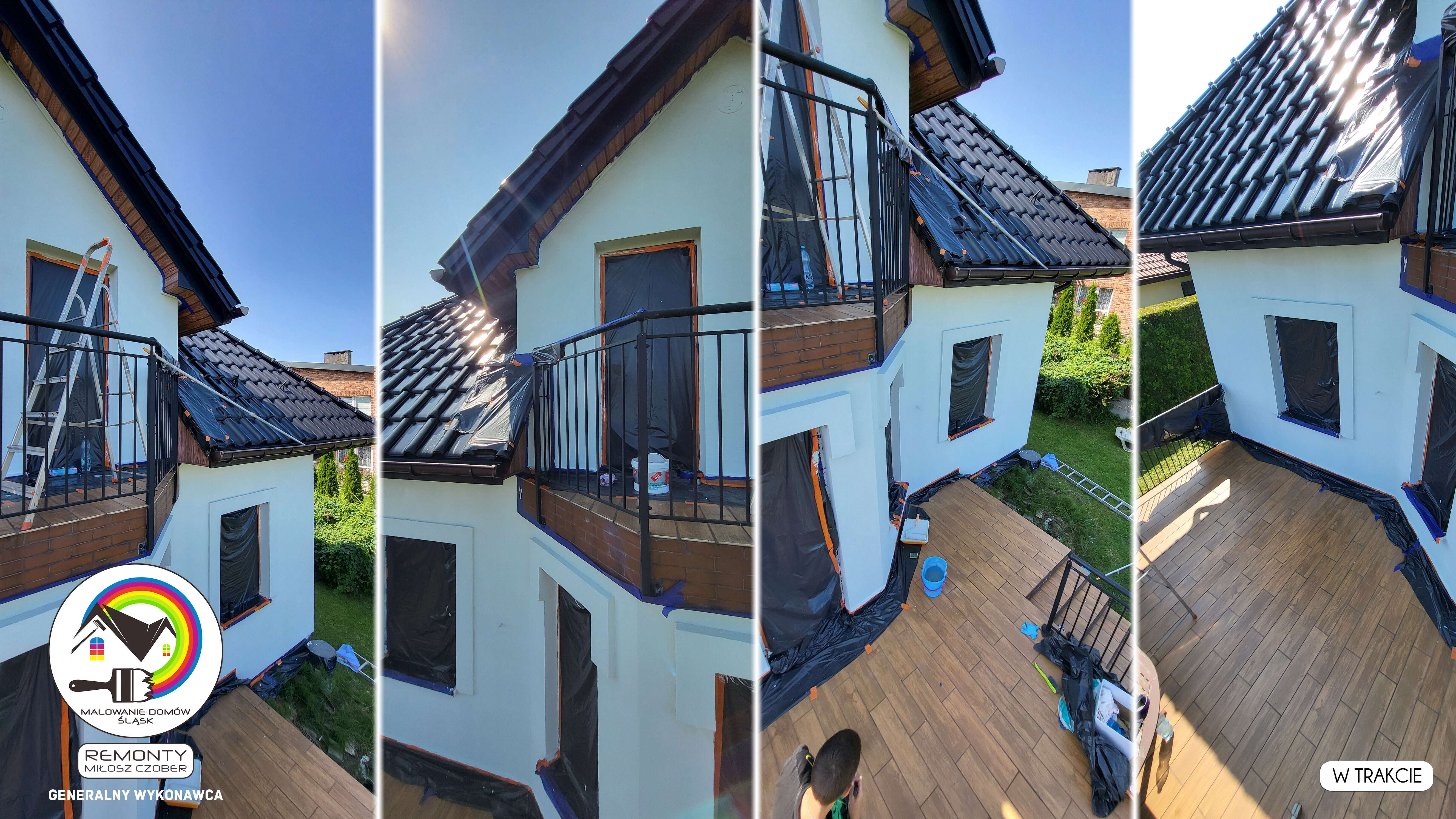 Zakres wykonanych prac: malowanie elewacji / naprawa / zabezpieczenie ściany / montaż systemu rynien / wymiana podbitki dachu / odświeżenie dachu / szlifowanie / malowanie / szlifowanie dachu / porządnie do samej blachy :-) / dach po odświeżeniu / całkowita wymiana fug na tarasie / efekt końcowy po wymianie fug / dodatkowe czyszczenie / wymiana paneli na tarasie / efekt końcowy wymiany paneli.