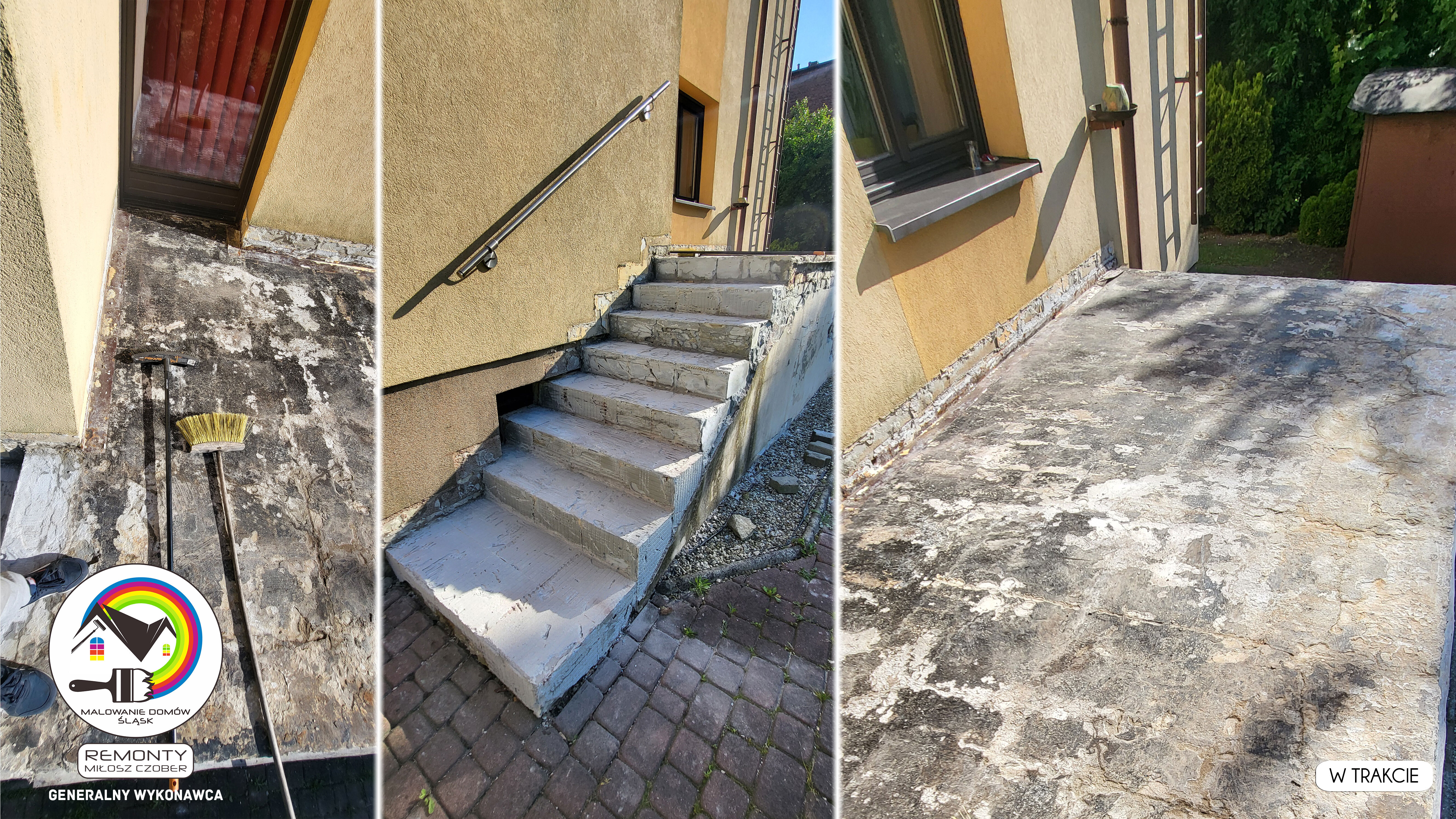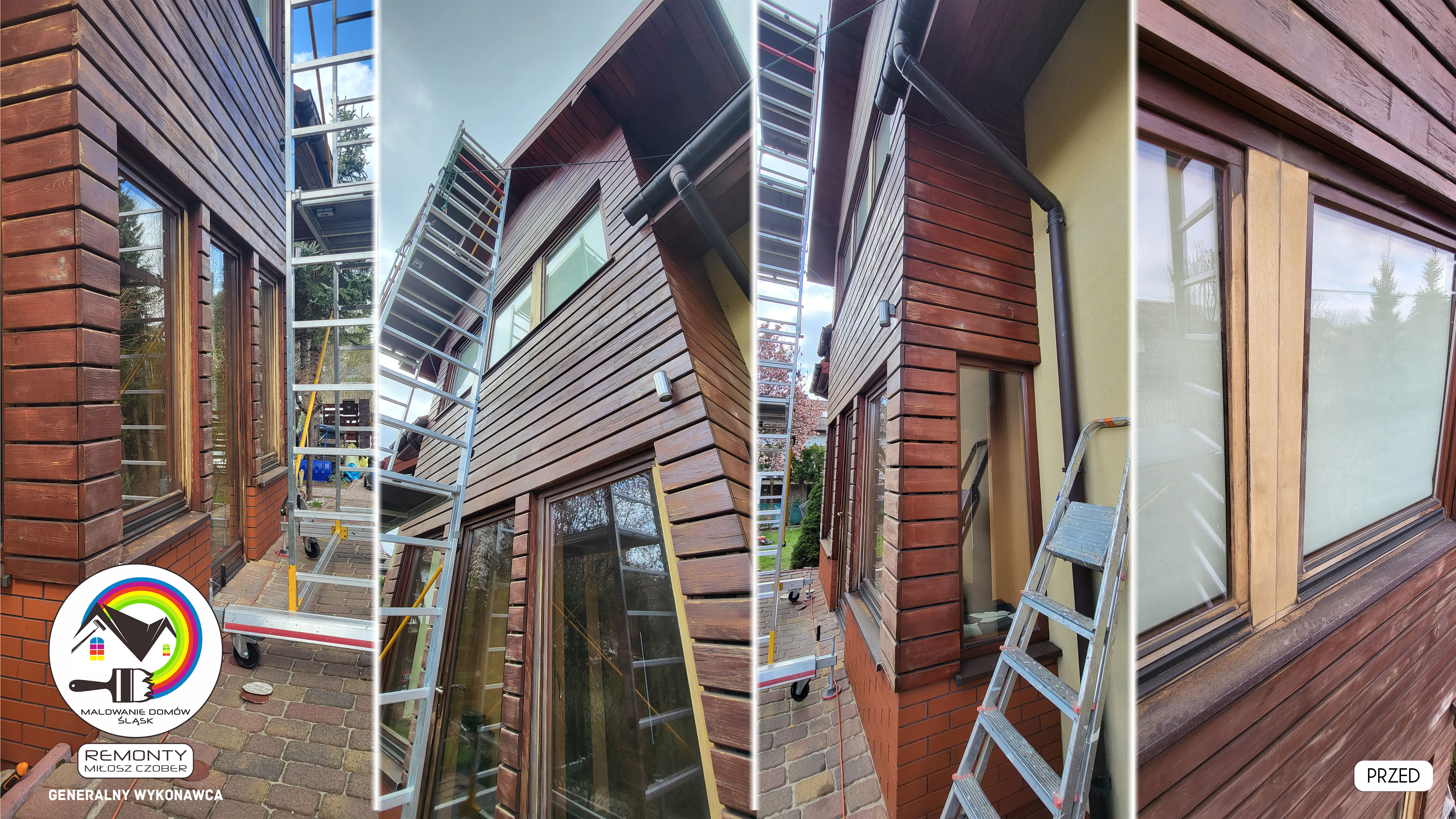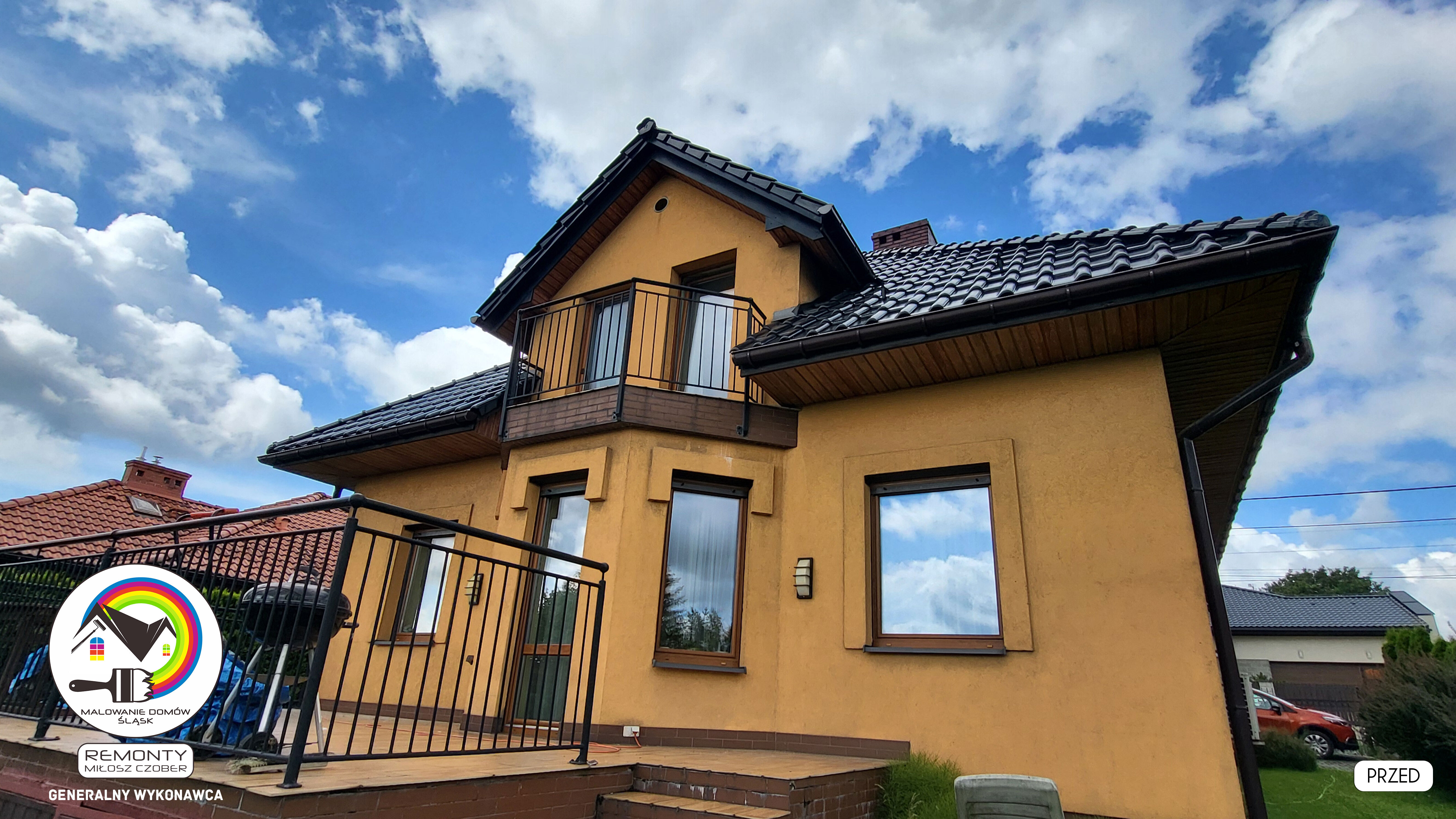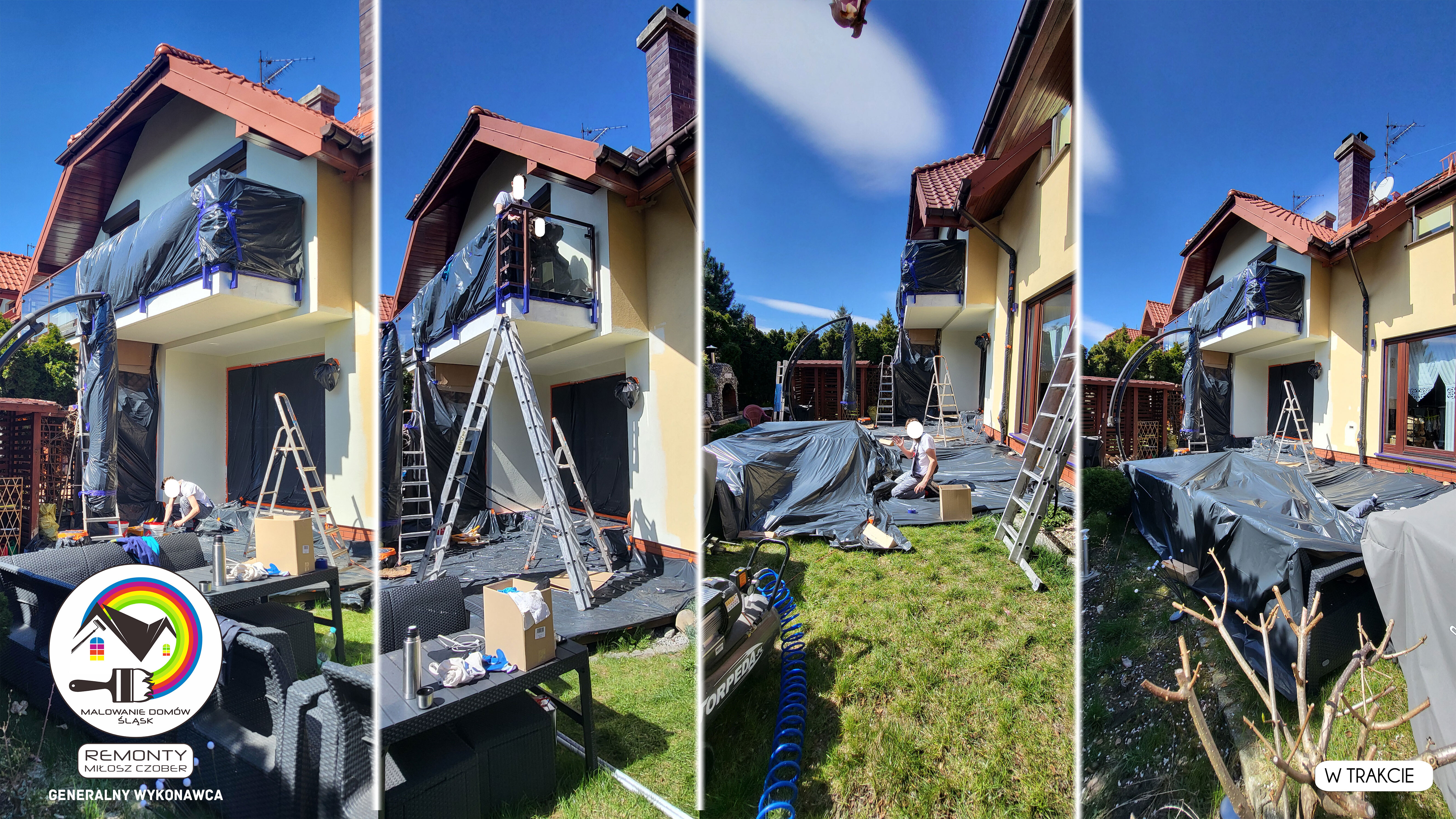 Zakres wykonanych prac: malowanie elewacji / naprawa / zabezpieczenie ściany / montaż systemu rynien / wymiana podbitki dachu / odświeżenie dachu / szlifowanie / malowanie / szlifowanie dachu / porządnie do samej blachy :-) / dach po odświeżeniu / całkowita wymiana fug na tarasie / efekt końcowy po wymianie fug / dodatkowe czyszczenie / wymiana paneli na tarasie / efekt końcowy wymiany paneli.