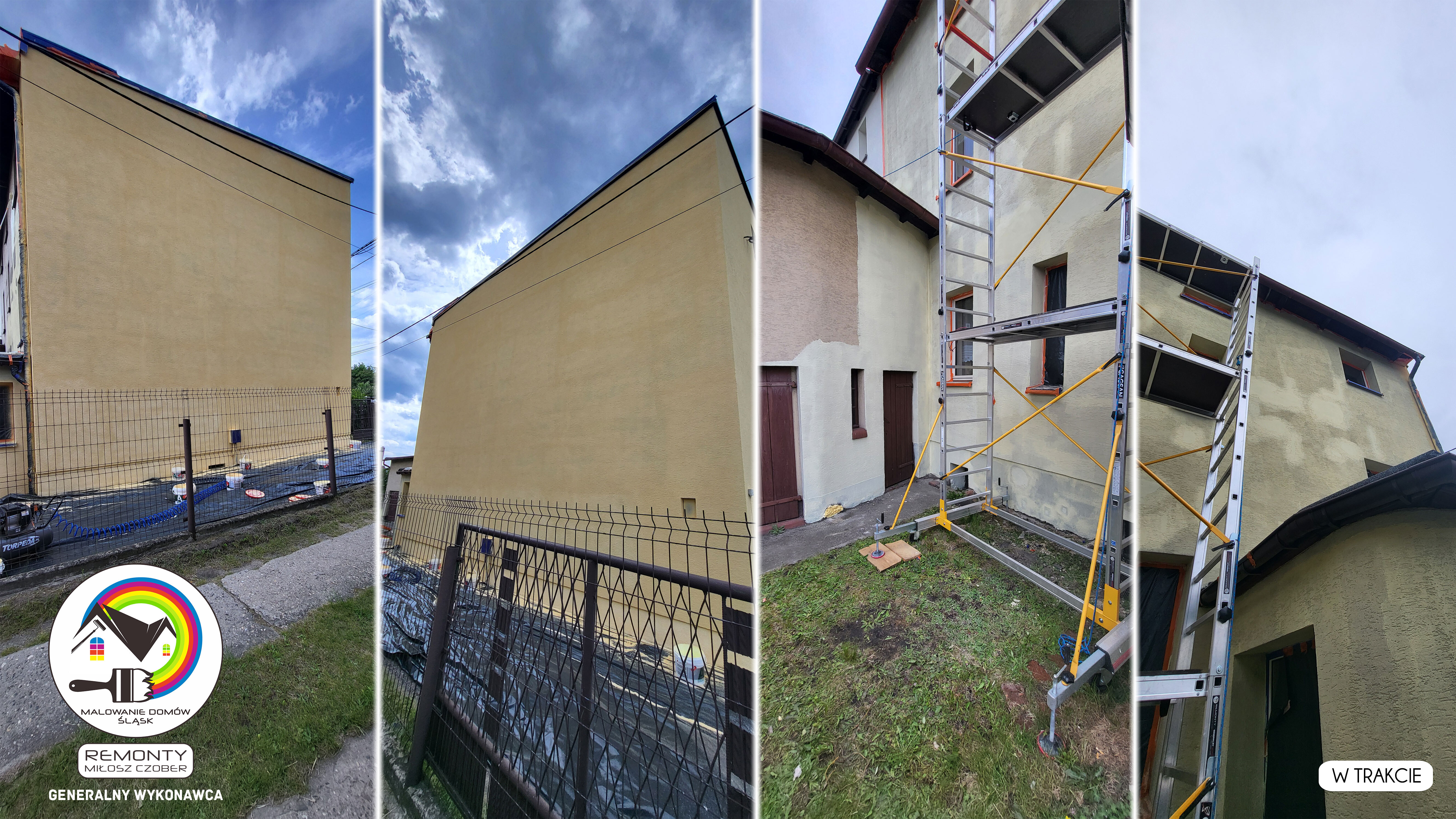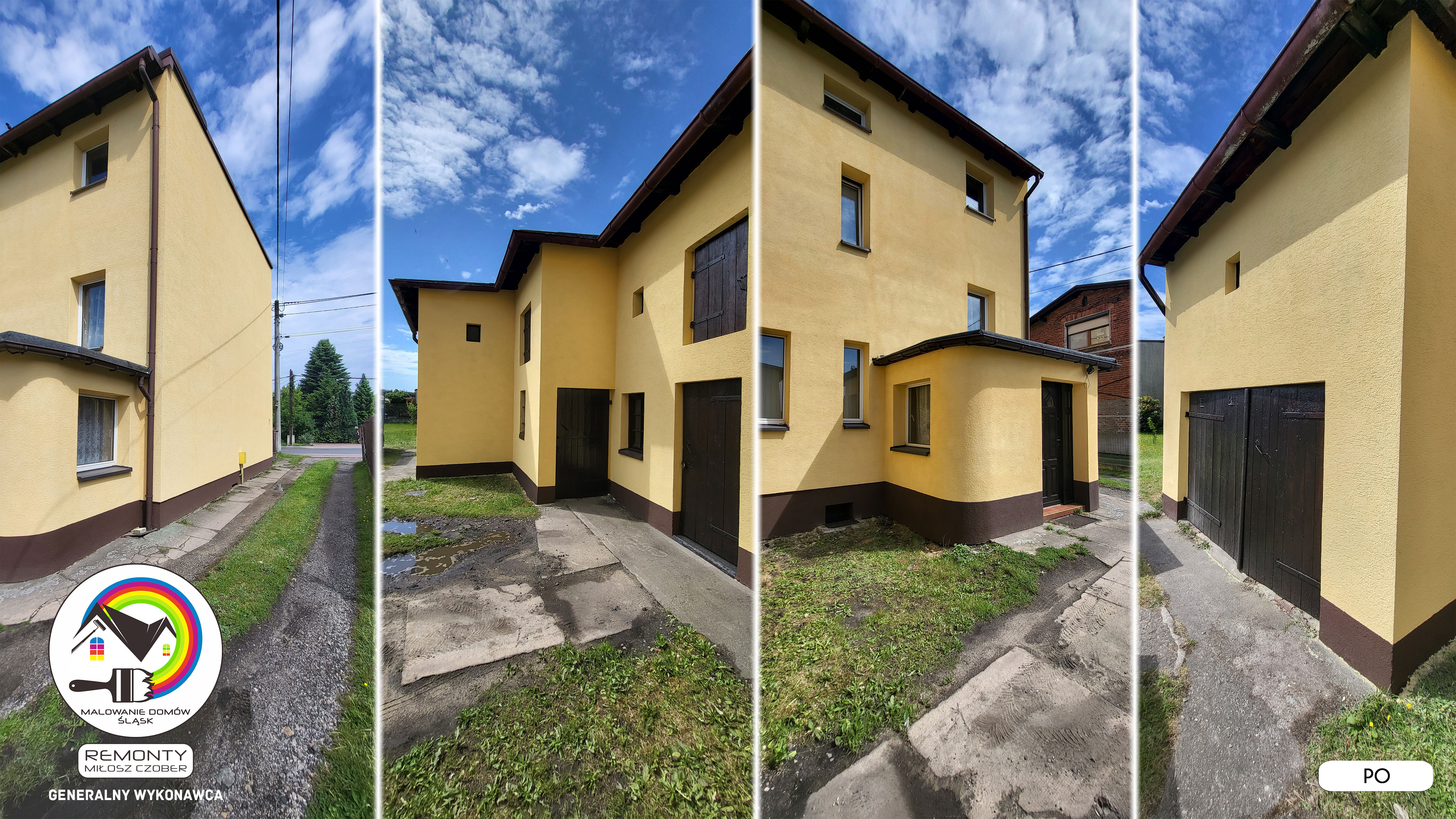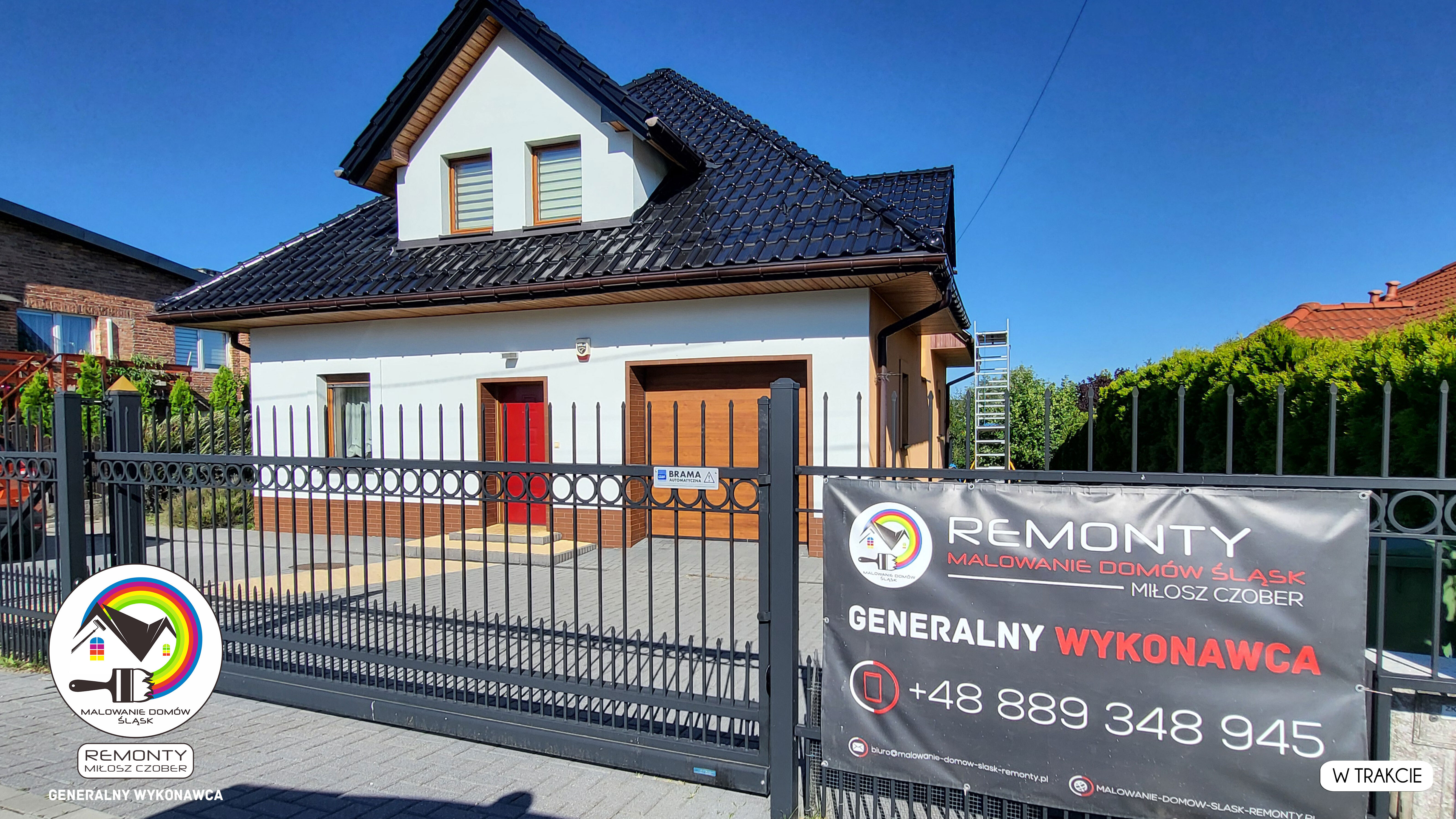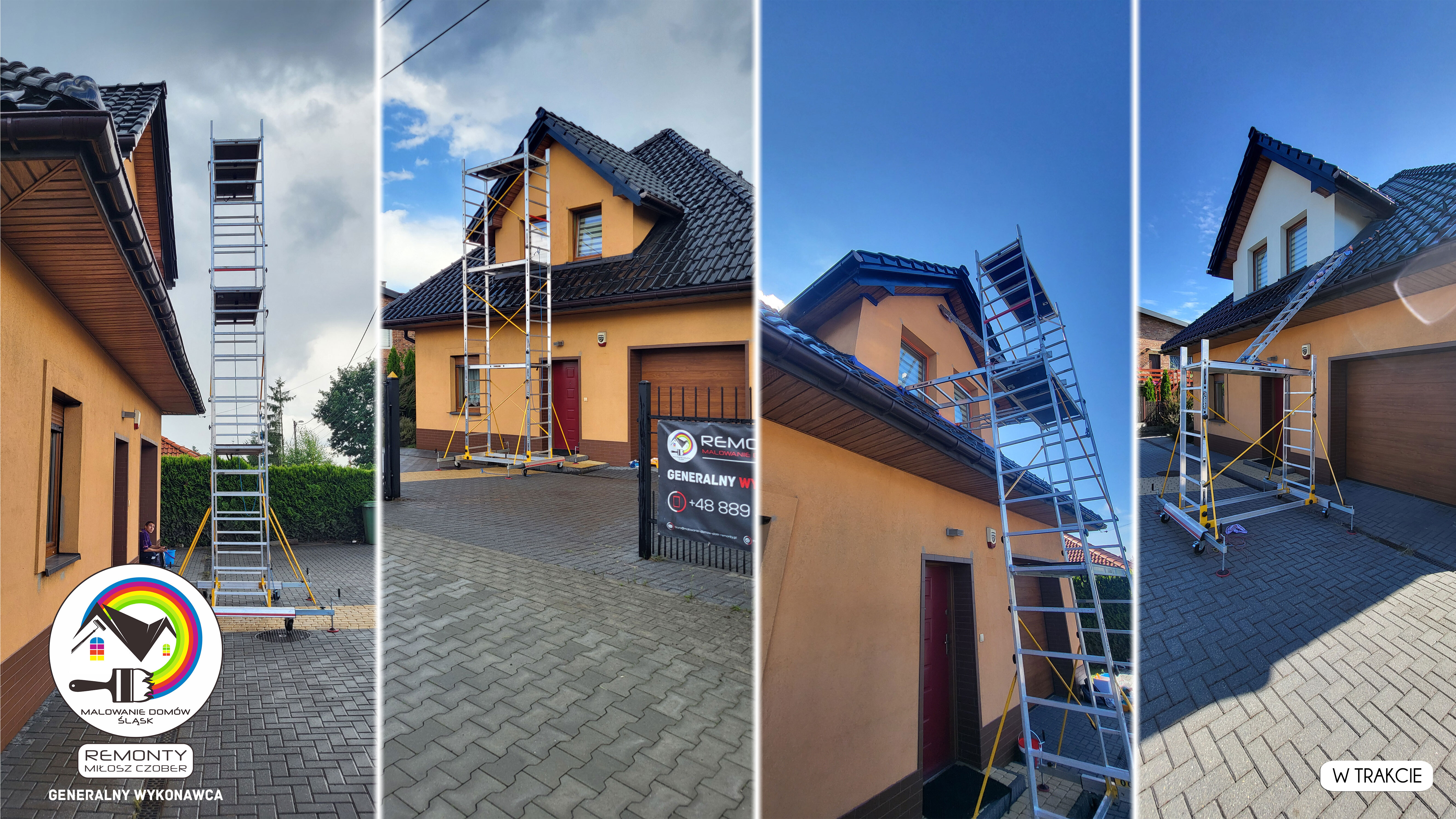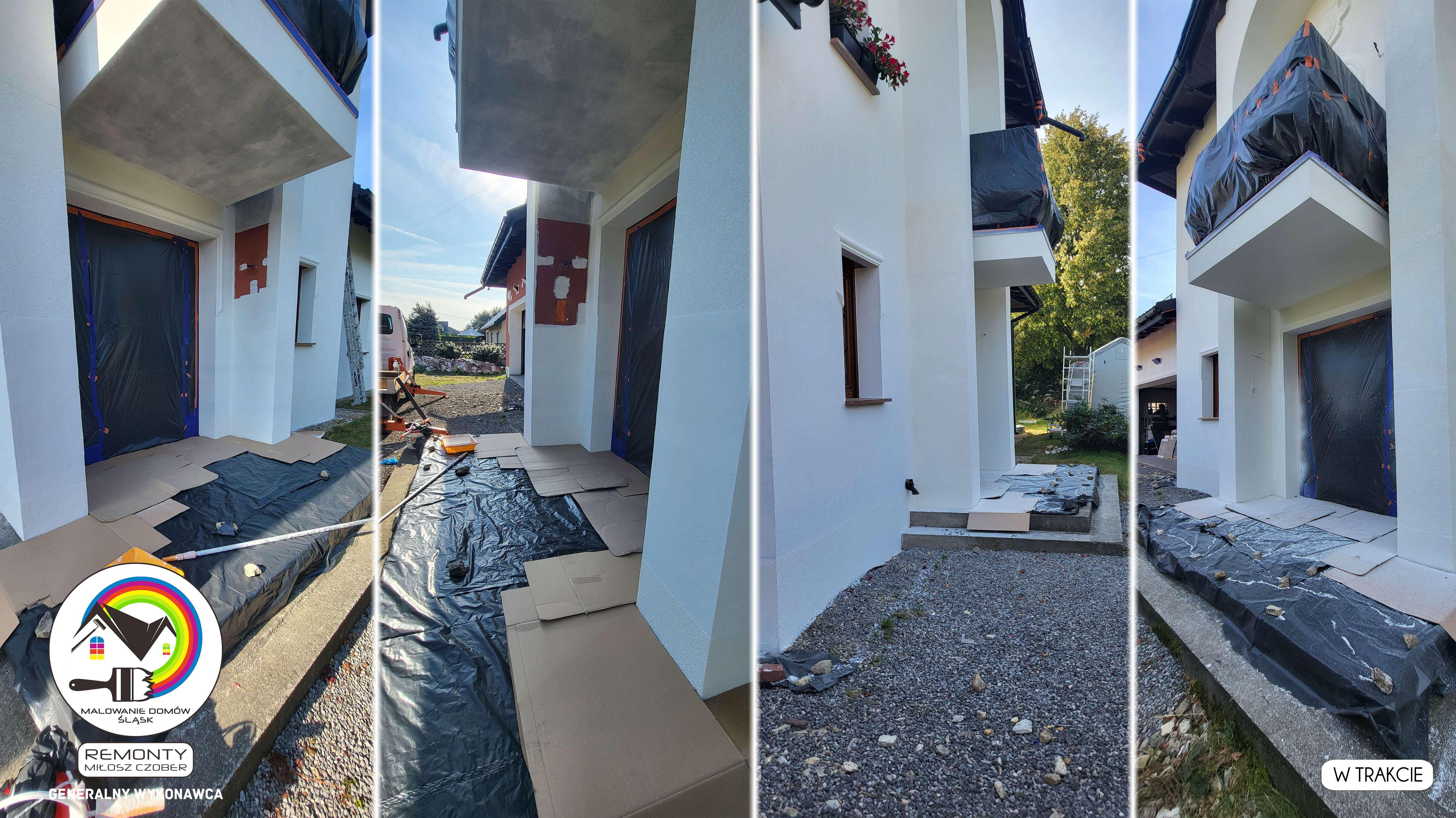 Zakres wykonanych prac: malowanie elewacji / naprawa / zabezpieczenie ściany / montaż systemu rynien / wymiana podbitki dachu / odświeżenie dachu / szlifowanie / malowanie / szlifowanie dachu / porządnie do samej blachy :-) / dach po odświeżeniu / całkowita wymiana fug na tarasie / efekt końcowy po wymianie fug / dodatkowe czyszczenie / wymiana paneli na tarasie / efekt końcowy wymiany paneli.